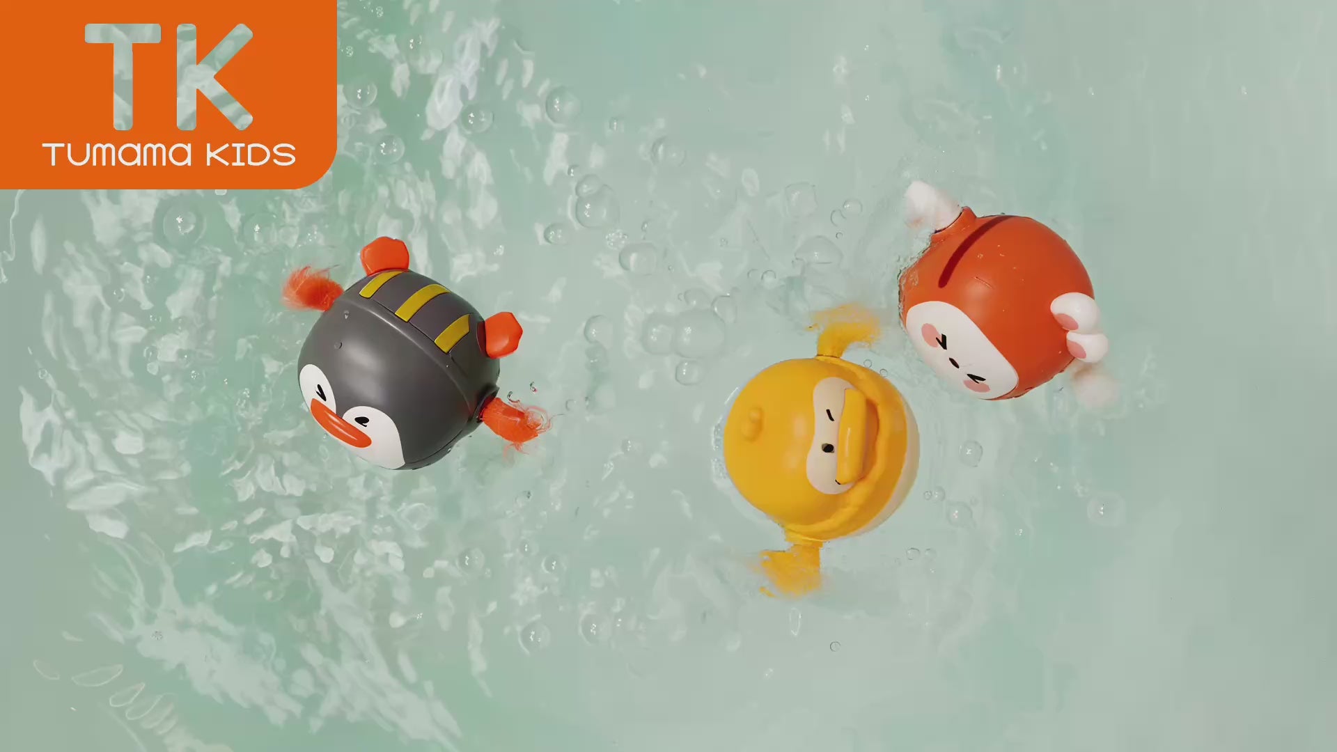 Close-up of three wind-up bath toys shaped like a duck, bunny, and penguin paddling across the surface of bathwater. The yellow duck toy is in focus, with its orange flippers in motion, showing how the toys smoothly glide through the water.