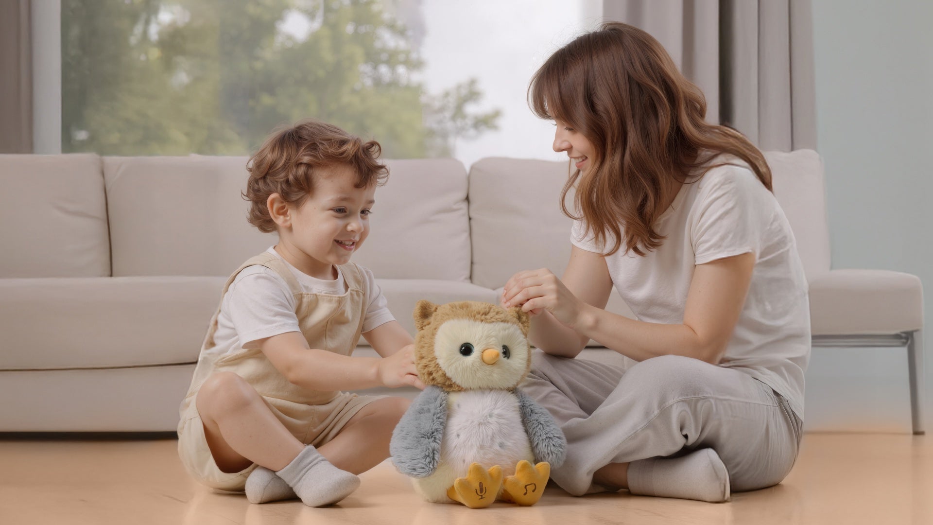 Mother and child sitting on the floor in a living room, smiling and interacting with an animated and talking owl plush toy. The toy features music control through its foot, with instructions shown: